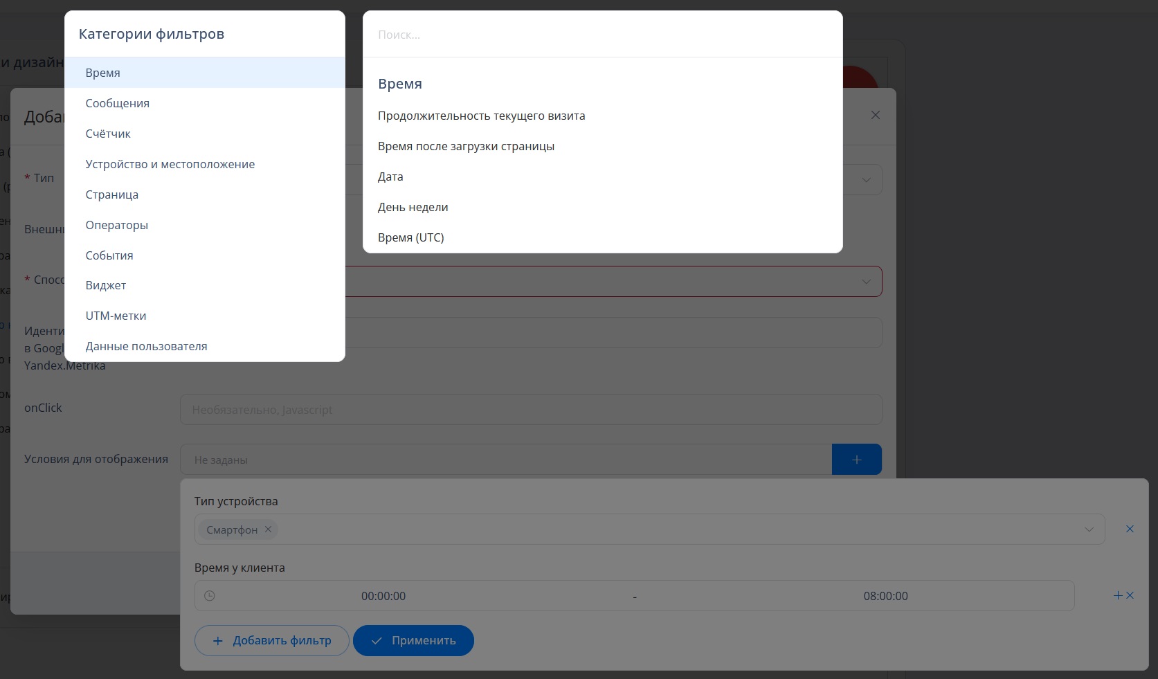 | | | В данном элементе прописывается JavaScript-код, который должен выполниться при клике. К примеру, расположенный ниже код выведет на экран диалоговое окно с текстом "Привет!" при клике на элемент меню. | | | С помощью элемента "JavaScript" также можно вызвать методы Javascript API. | | | Каждый элемент меню имеет набор свойств, которые можно изменять при создании и редактировании. | | | Ниже перечислены свойства, доступные для элементов меню. | | | В этом поле можно выбрать подходящий элемент меню виджета. | | | Позволяет изменить цвет фона и текста иконки, а также саму иконку, которая будет отображена в меню. | | | В окне выбора иконки можно выбрать одну из предлагаемых иконок или загрузить своё изображение и использовать его в качестве иконки. | | | При включенной опции "Как в настройках вкладки" поле "Иконка" будет скрыто и его значение будет заполнено автоматически из настроек вкладки. Подробнее о настройке вкладок вы можете прочитать в статье "Дополнительные вкладки". | | | В этом поле нужно указать как будет называться элемент меню. | | | При включенной опции "Как в настройках вкладки" поле "Название" будет скрыто и его значение будет заполнено автоматически из настроек вкладки. Подробнее о настройке вкладок вы можете прочитать в статье "Дополнительные вкладки". | | | Идентификатор события в Google Analytics и Yandex.Metrika | | | Здесь можно указать идентификатор события, который отправится в Yandex или Google при клике по данному элементу меню. Для настройки идентификатора события выполните следующие шаги: 1. Зайдите в Личный кабинет Яндекс.Метрики. 2. Перейдите в раздел "Цели" и кликните кнопку "Добавить цель". | | | Если у вас уже создана цель, скопируйте её и пропустите шаги 2 - 4. | | | 3. В появившемся окне выполните перечисленные действия: - Введите название для цели;