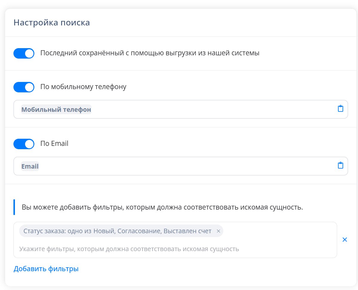 - При использовании блока "Найти в CRM" в сценариях и ботах, есть возможность записать данные в глобальные переменные для дальнейшего использования в сценарии. Например, если сделка "в работе", то сценарий пойдет по одной ветке, если "исполнено" - по другой.